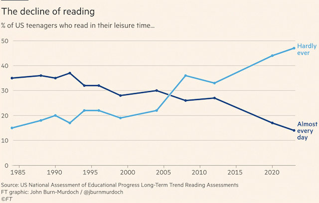 The collapse of reading is driving declines in various measures of cognitive ability. Reading is associated with a number of cognitive benefits including improved memory and attention span, better analytical thinking, improved verbal fluency, and lower rates of cognitive decline in later life.