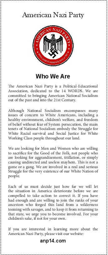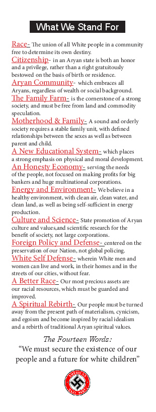 What caught my eye the other morning while I was “going over the basics” was the section on Culture and Science. In my abbreviated version, it reads: “Culture and Science- [We demand] State promotion of Aryan culture and values, and scientific research for the benefit of society, not large corporations.”