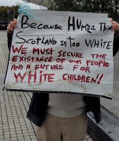 In Scotland a few weeks ago, a man was arrested for displaying a sign that included the fourteen-words: “We must secure the existence of our people and a future for white Children!” I mean, my God, how hateful: wanting to take care of your people and tending to your children’s future! Oh the humanity!