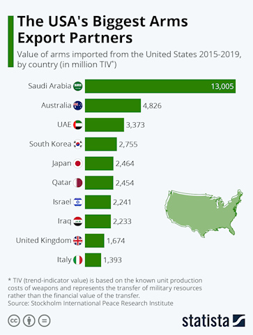 Fun fact: Saudi Arabia is the largest foreign purchaser of US arms in the world, and by a huge margin. In fact, Saudi Arabia has the world’s fifth-largest defense budget after the United States, China, Russia, and India. In some years, it actually takes third place, outpacing Russia and India.