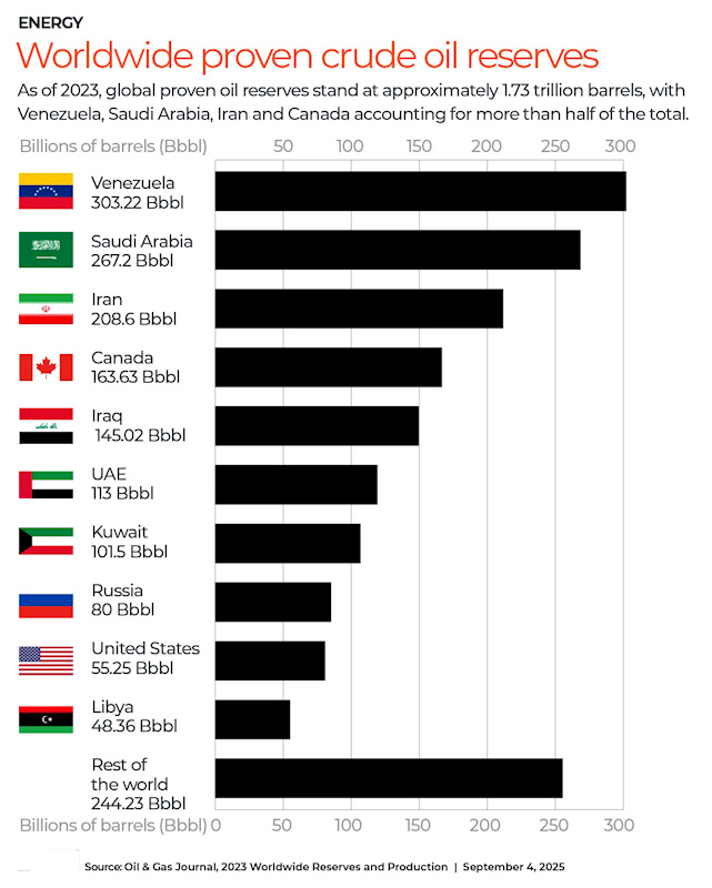 Here’s a fun fact: Venezuela with 303 billion barrels (Bbbl) is home to the largest known reserves of oil in the world. Full stop. Saudi Arabia ranks second with 267.2 Bbbl, followed by Iran at 208.6 Bbbl and Canada at 163.6 Bbbl. Together, these four countries account for more than half of global oil reserves. The United States, by comparison, holds about 55 Bbbl, placing it ninth globally. This means that Venezuela’s reserves are more than five times larger than those of the US.